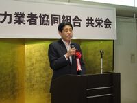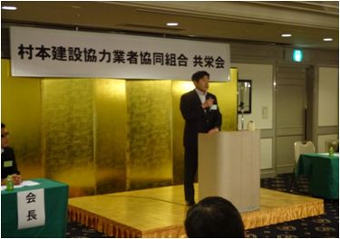 また来賓として出席した村本建設株式会社村本社長は「熊本の地震では49名もの尊い命が失われご冥福をお祈りする。昨今の建設業界に対しては、杭のデーター偽装、新名神の橋げたの落下、羽田、松山、福岡など各地の空港の地盤改良に関連する問題など一般の国民の目から見ると大変な不信感がつのっていると思われる。建設業界の各社3月決算は良好にも関わらず大きな問題が起きている。私たちは大いに反省して信頼の回復に努めなくてはならない。経営者から作業員に至るまで1企業の努力では足りない。1次、2次の協力会社、そして作業員ひとり、一人に至るまで同じ思いで信頼の回復に努めなければならない。共栄会の使命は重く、また期待するところは益々大きなものとなっている。」と挨拶されました。